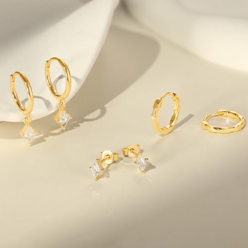 Material: BrassMetal type: No Metal TypeBack Finding: Push BackGem type: No GemstoneItem type name: Hoop EarringsGold Trendy Earrings Set: This earrings set includes 3 pairs of earrings, featuring rhombic crystal zirconia earrings and studs, and minimalist huggie earrings, perfect for every woman. Ideal for women with multiple ear piercingsWomen-Friendly Material: Crafted with sterling silver posts and 14K real gold plating, these earrings are hypoallergenic, tarnish-free, and free of nickel and lead. Designed with care for delicate comfort, they are perfect for every womanLightweight & Comfortable: Each pair is lightweight and comfortable, ideal for all-day wear, whether for daily use or evening outingsPretty Packing: Packaged in a exquisite box, these earrings make an ideal gift for any occasion. Their timeless designs ensure they never go out of style, making them a perfect present or a treat for yourselfAfter-Sales: Eathareel is committed to providing perfect shopping experience to every customer. If you have any questions, message us via AMAZON at any time, we will get back to you within 24 hours Perfect for everyday use. supreme materials and excellent craftsmanship ensure long-lasting durability.
