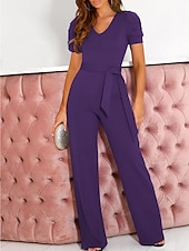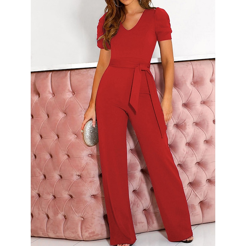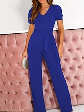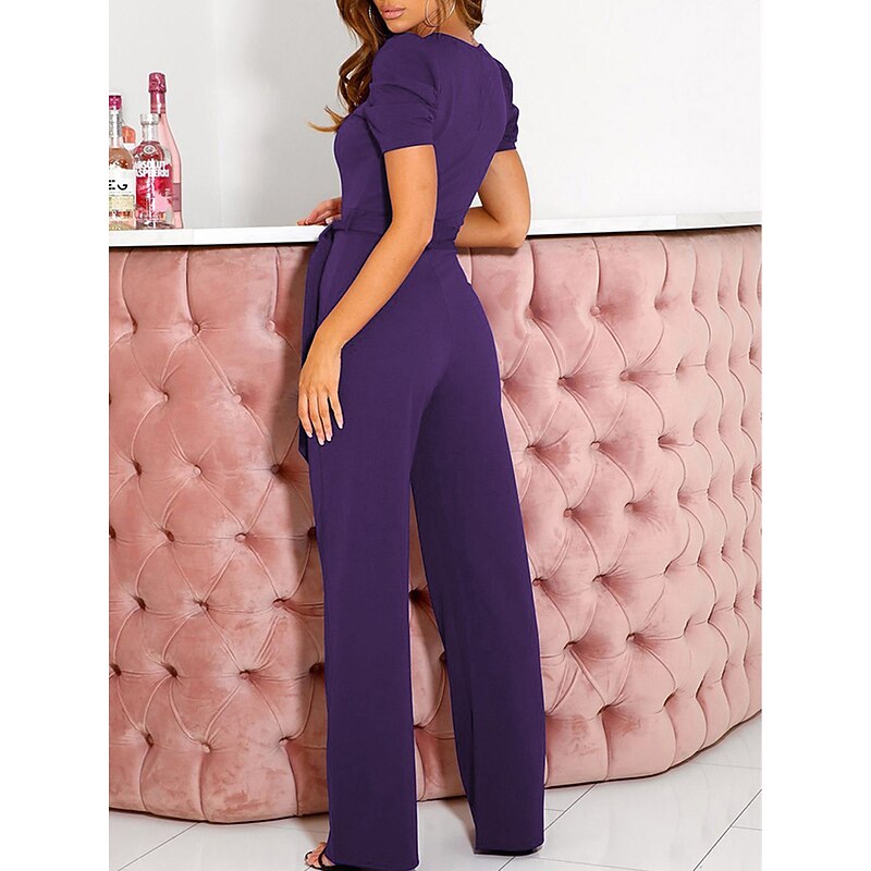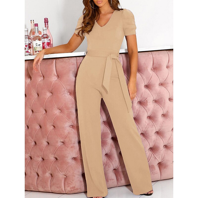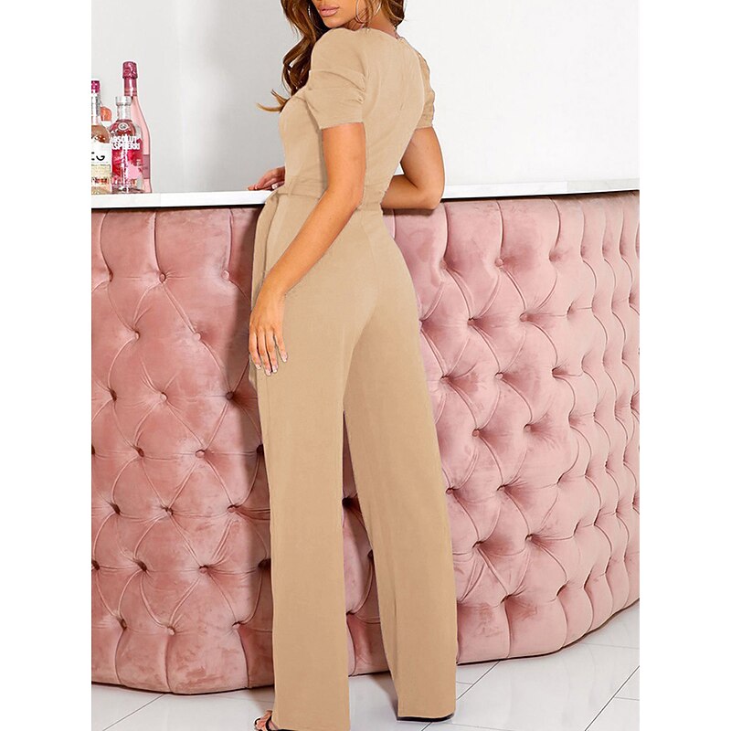 Highlights [Fabric] : Crafted from high-quality polyester, this women's jumpsuit offers a smooth and comfortable feel, ensuring a micro-elastic fit perfect for extended wear during spring and summer seasons. The fabric boasts a slight stretch, adding to the garment's overall comfort and versatility. [Fit and Style] : The jumpsuit features a regular fit with a high waist design that emphasizes the wearer's silhouette. The lace-up detail adds a chic element, while the wide-leg pants ensure ease of movement and a chic, relaxed look. The V-neckline and short sleeves contribute to a refined and elegant appearance, ideal for both formal and business settings. [Design Highlights] : This jumpsuit stands out with its sophisticated V-neck cut paired with chic short puff sleeves. The lace-up high waist accent and the flowing wide-leg design are both trendy and flattering, providing a polished silhouette for any occasion. [Occasions] : Perfect for weddings, work, office settings, or even casual day-to-day activities, this jumpsuit suits a variety of occasions, adding an elegant touch to street style or any formal environment. It's the go-to outfit for those who seek both style and comfort. [Size Range] : Available in a range of sizes including S, M, L, XL, XXL, and 3XL, this jumpsuit caters to various body types, ensuring a suitable fit for all. It's recommended to consider selecting a size larger than usual for optimal comfort. Perfect for everyday use. first-class materials and excellent craftsmanship ensure long-lasting durability.