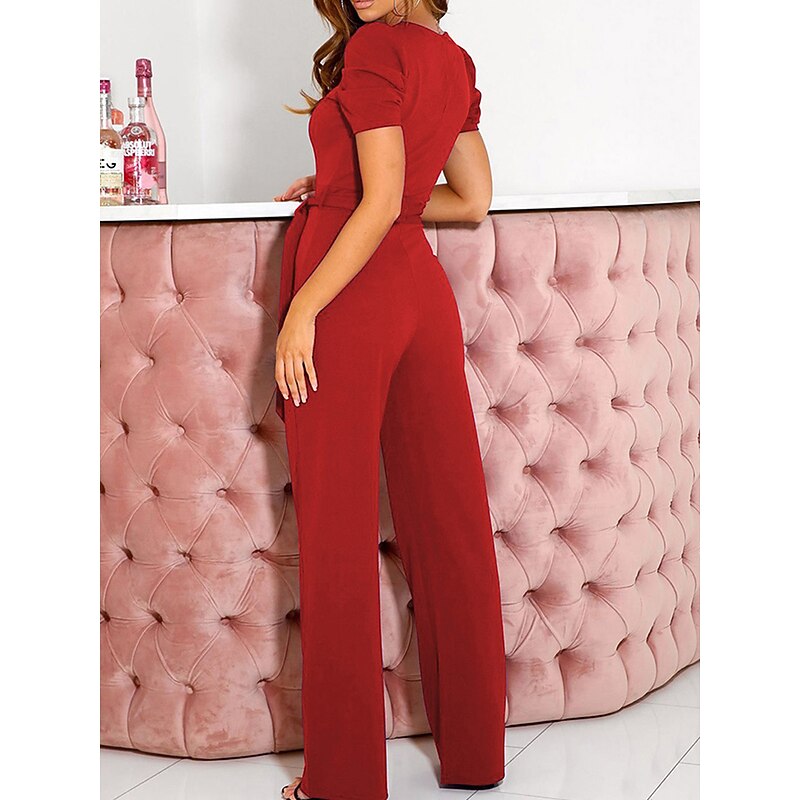 Women's Normal Jumpsuit Elegant Solid Color Short Sleeve V Neck Lace up High Waist Wedding Office Regular Fit Black Army Green Red Summer