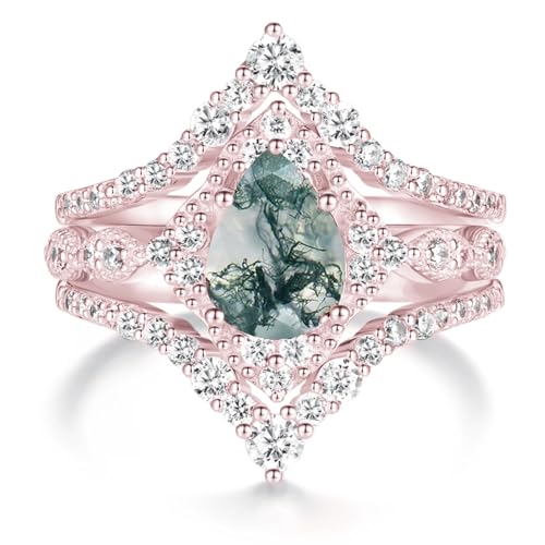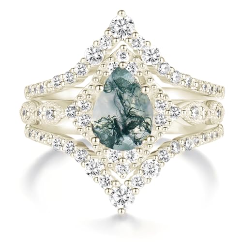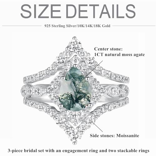 3PCS Natural Moss Agate Wedding Ring Set for Women with Moissanite 1CT Center Pear Cut Natural Moss Agate Ring Set 925 Sterling Silver 10K 14K 18K Gold