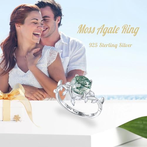 Ring size: 6Material: BaseMetal type: Sterling SilverGem type: Natural moss agateAgate Ring Deaign: The spiritual meaning of Moss Agate is all about new beginnings,represent vitality. This moss agate ring makes women with exceptional and noble elegant temperamentNatural Moss Agate Ring Material: This womens agate ring is made from durable and long-lasting 925 sterling silver material, ensuring it will be treasured for years to comeNatural Moss Agate: Every moss agate is natural,the shades are vary, making each one unique. It is normal that the one you receive will not the same as our picture. The rich colors of water grass agate brings you a different visual experienceMoss Agate Jewelry: Well packed in a Lypic Gift Box, suitable for Birthday, Mother's Day, Valentine's Day, Wedding, Engagement, Christmas, Party, Anniversary, Daily, Work time. Good to be your love for her, couples, mother, daughter, best friend, Friendship, Sisters, Cousin, Brother, Father, Grandmother, Daughter, BridesmaidJewelry Maintenance: Avoid wearing jewelry while swimming. Wipe the surface of the jewelry with the included jewelry cleaning cloth every day. Please keep it sealed and away from light when not wearing it. You can also use toothpaste and toothbrush to scrub the jewelry Perfect for everyday use. supreme materials and excellent craftsmanship ensure long-lasting durability.