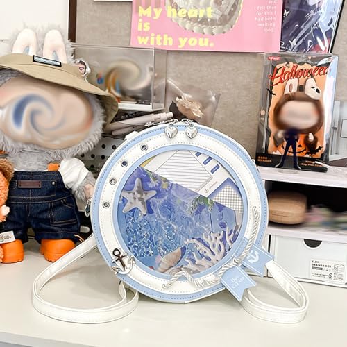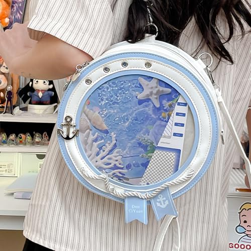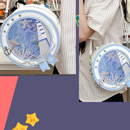 • DESIGN FEATURES: Nautical-themed round crossbody bag with decorative rope details, anchor charm, and porthole-inspired frame in navy blue and white color scheme