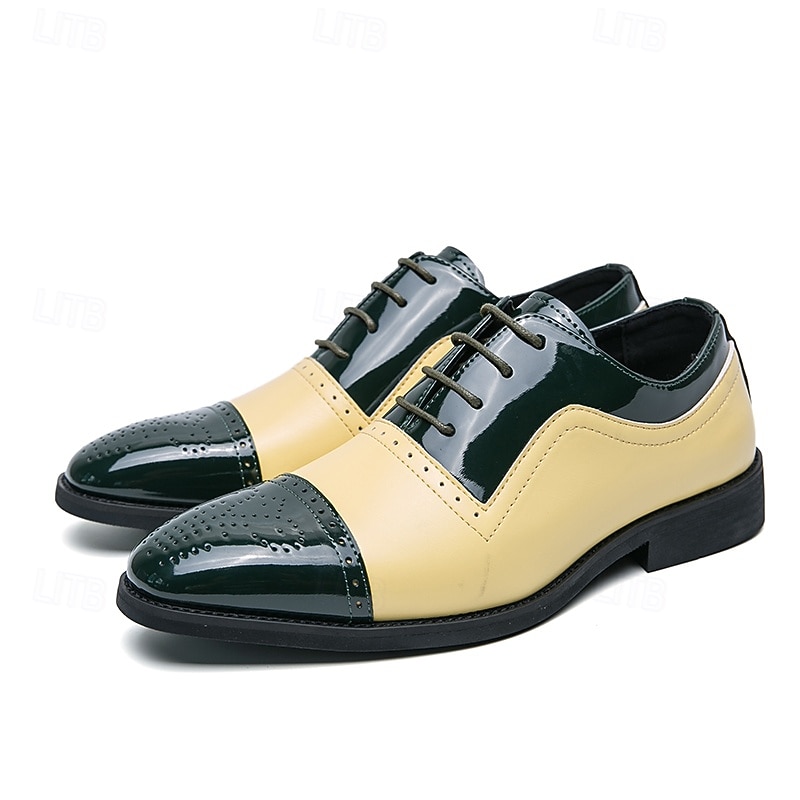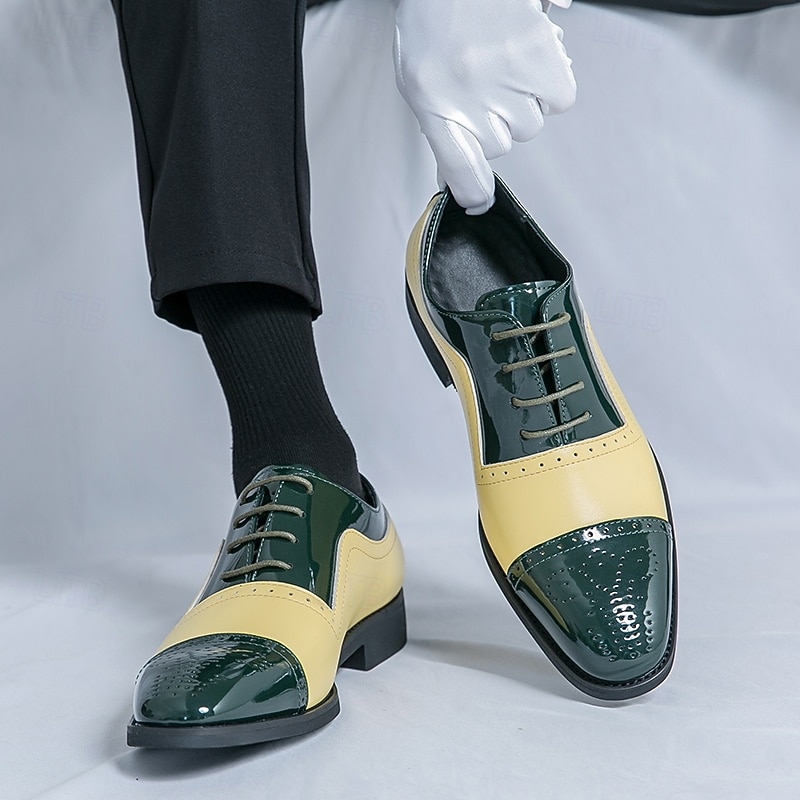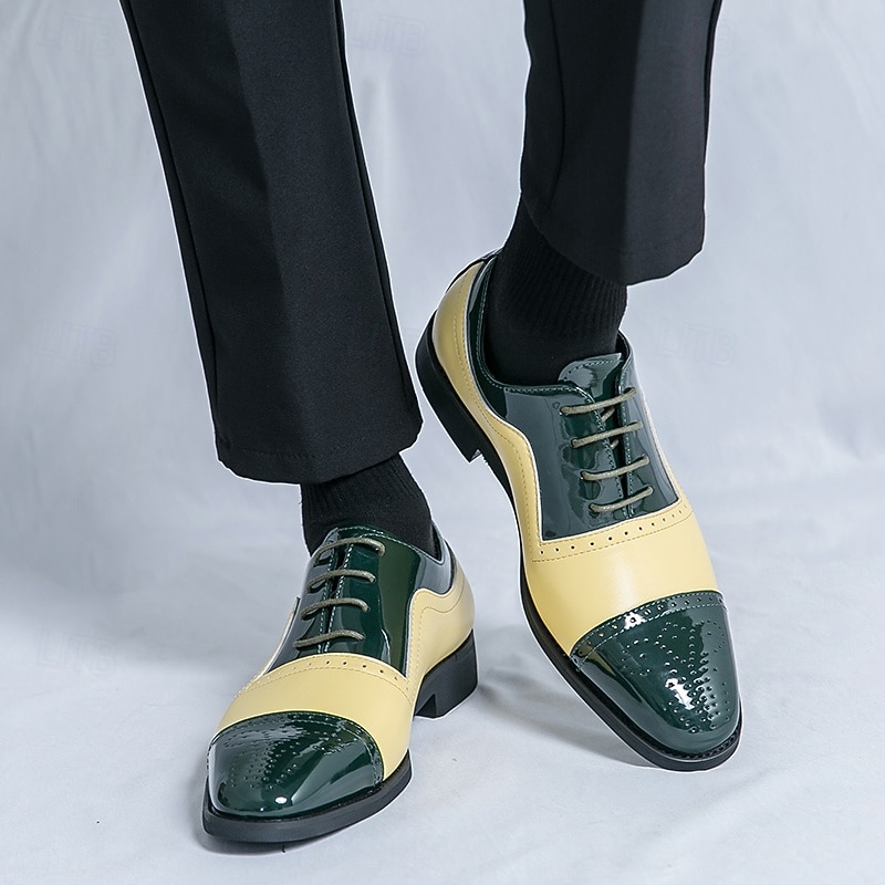 trending ! Men's Two-Tone Patent Leather Oxford Shoes, Green and Beige Brogue Dress Shoes for Weddings, Parties and Formal Events