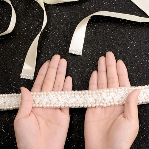 Faux Pearl Wedding Bridal Ribbon Belts, Pearl Beaded Sparkle Sewn Accessories Dress Matching, 2.7 meters