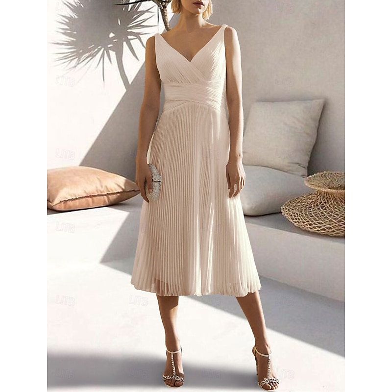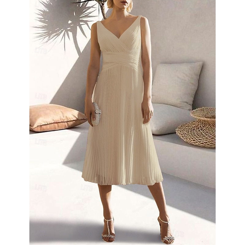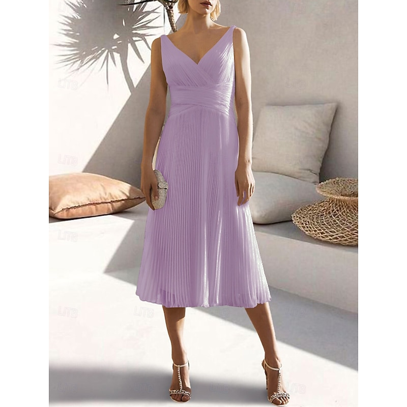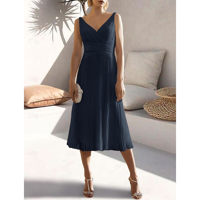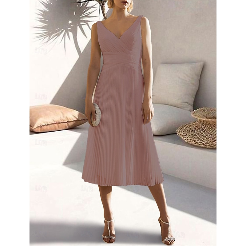 More information about A-Line Cocktail Dresses Elegant Dress Formal Wedding Guest Tea Length Sleeveless V Neck Chiffon with Ruched Pure Color Dresses