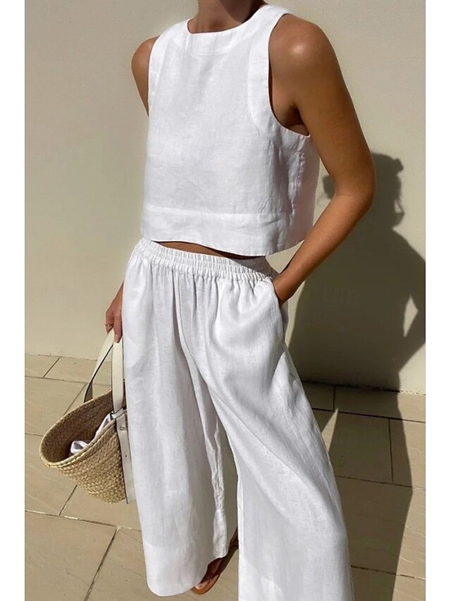 trending ! Women's Daily Shirt Linen-Inspired Sets Two Piece Sets Sleeveless Crew Neck Solid Color Ruched Daily Holiday White Yellow Dark Navy Summer Regular Fit