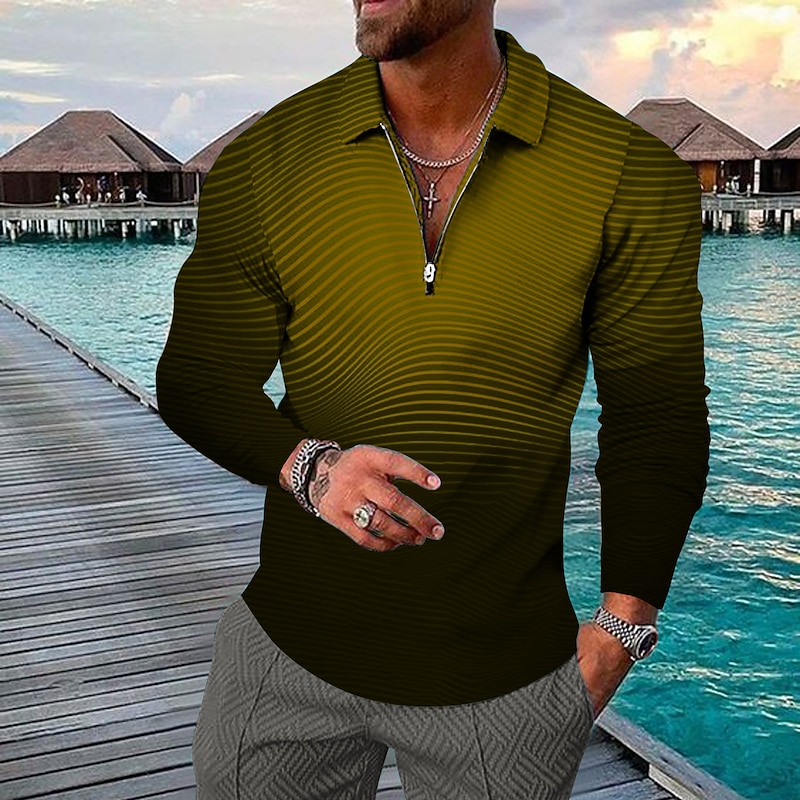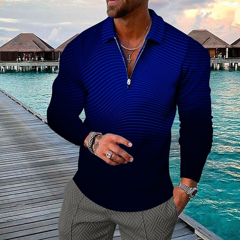 : The shirt showcases a striking 3D print with horizontal stripes, available in a dynamic gradient of colors including blue, green, black, purple, and yellow. A standout feature is the quarter zip front, adding a modern twist to the traditional polo design. The combination of these elements creates a visually appealing and versatile piece.