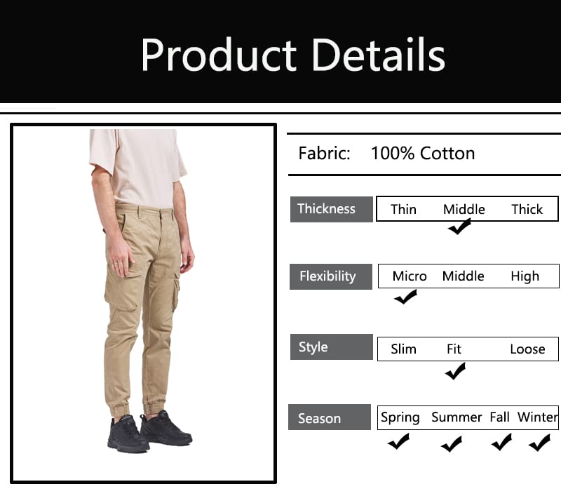 • Fabric:Men's Tapered Elastic Leg, work cargo pants is made of 100% cotton woven fabric, which has good breathability, comfy and softness.