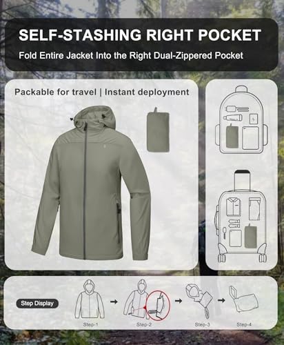 - 【SELF-STASHING RIGHT POCKET】 Fold entire jacket into the right dual-zippered pocket. Packable for travel. prompt deployment.