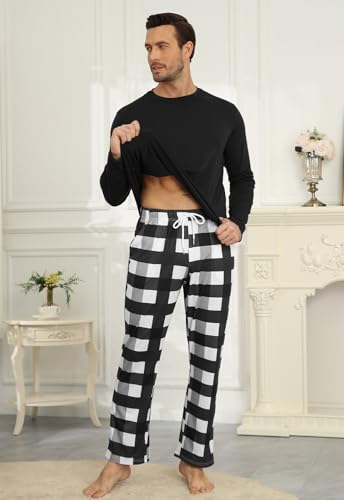 • PJ Sets Features: Men's 2 piece pajama sets come with long sleeve crewneck solid t-shirt and plaid drawstring elastic pajama pants with 2 side pockets which are accessible to keep your cell phone, keys, cards, or smaller items inside and keep your hands comfortable.